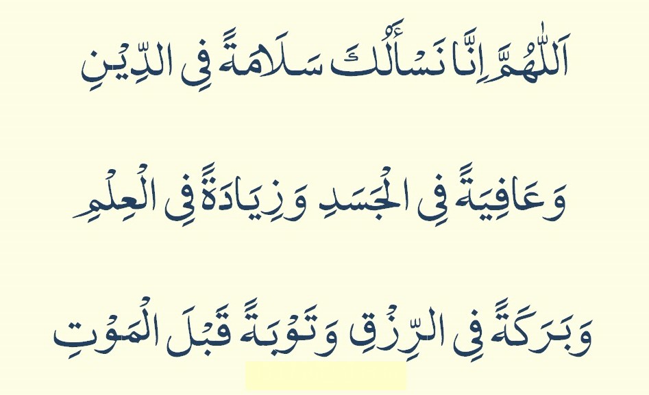 ALLAAHUMMA INNAA NAS ALUKA SALAAMATAN FID DIINI WA ‘AAFIYATAN FIL JASADI WA ZIYAADATAN FIL ‘ILMI WA BARAKATAN FIR RIZQI WA TAUBATAN QOBLAL MAUTI WA RAHMATAN ‘INDAL MAUTI WA MAGHFIRATAN BA’DAL MAUT.